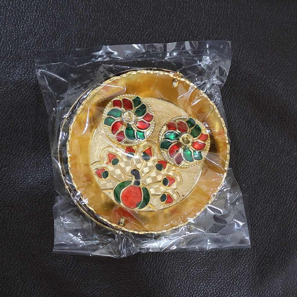 Elevate your aarti setup with this exquisitely crafted pooja basket thali. Designed in a traditional round tray with a folding handle, it features a colourful peacock meenakari motif and comes with two matching lidded bowls for roli–chawal, haldi, chandan or sindoor. The bright gold-tone finish and fine embossing add a festive sheen, while the compact size fits perfectly on the mandir shelf or aarti plate. Ideal for daily puja and as a graceful gift for weddings, griha pravesh and Diwali.